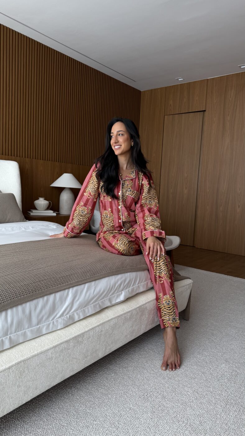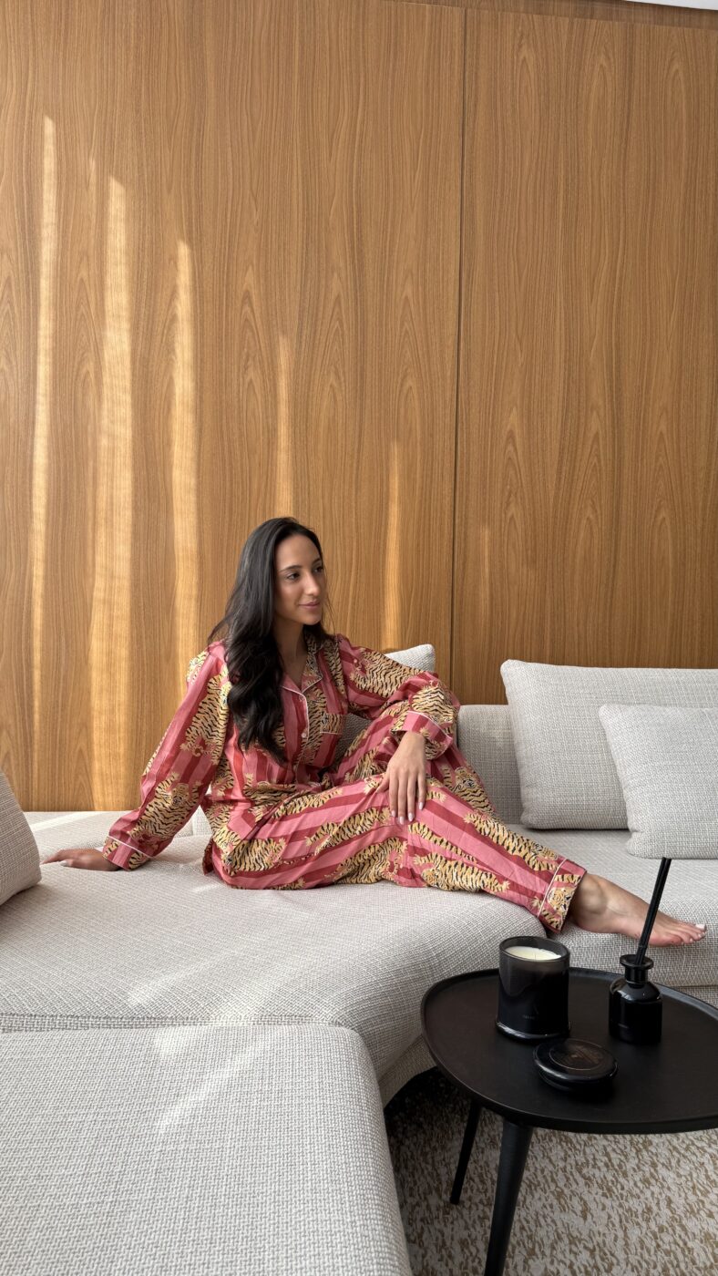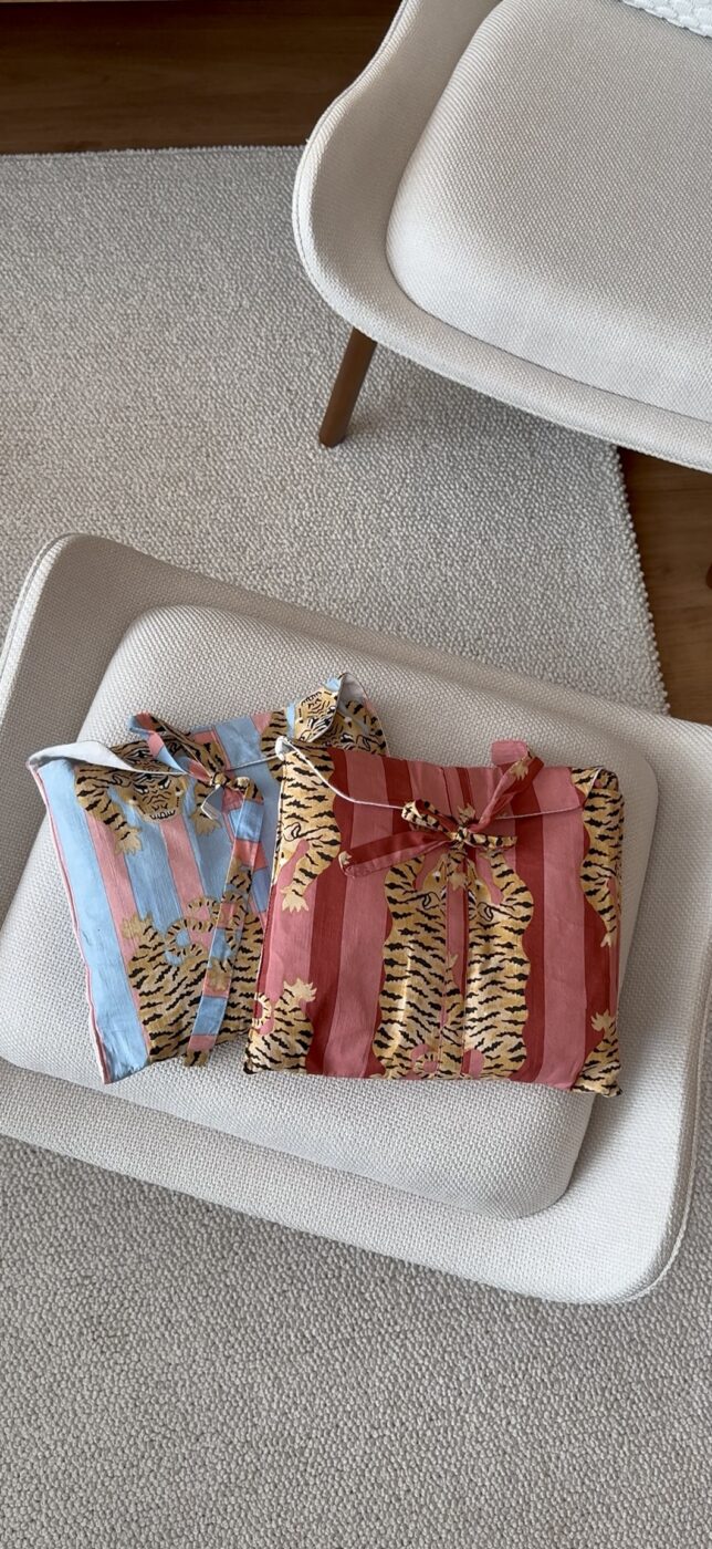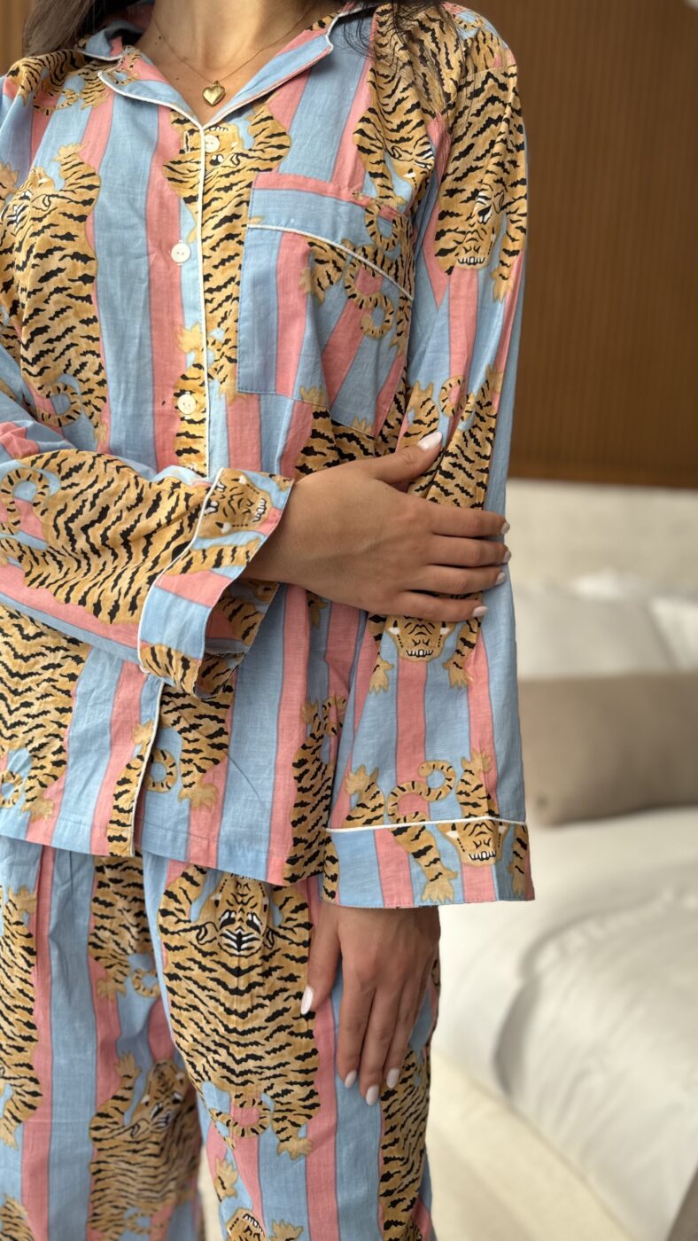Kit de pijama listrado com estampa de onça composto por 3 peças: camisa com abotoamento frontal, calça com cós em elástico e necessaire. 100% algodão.