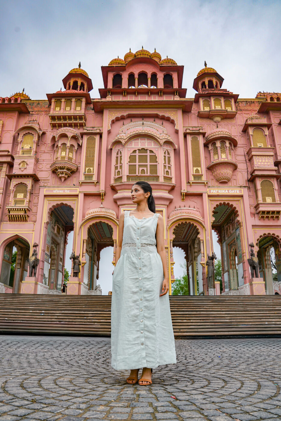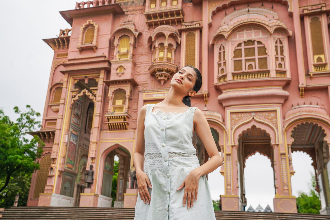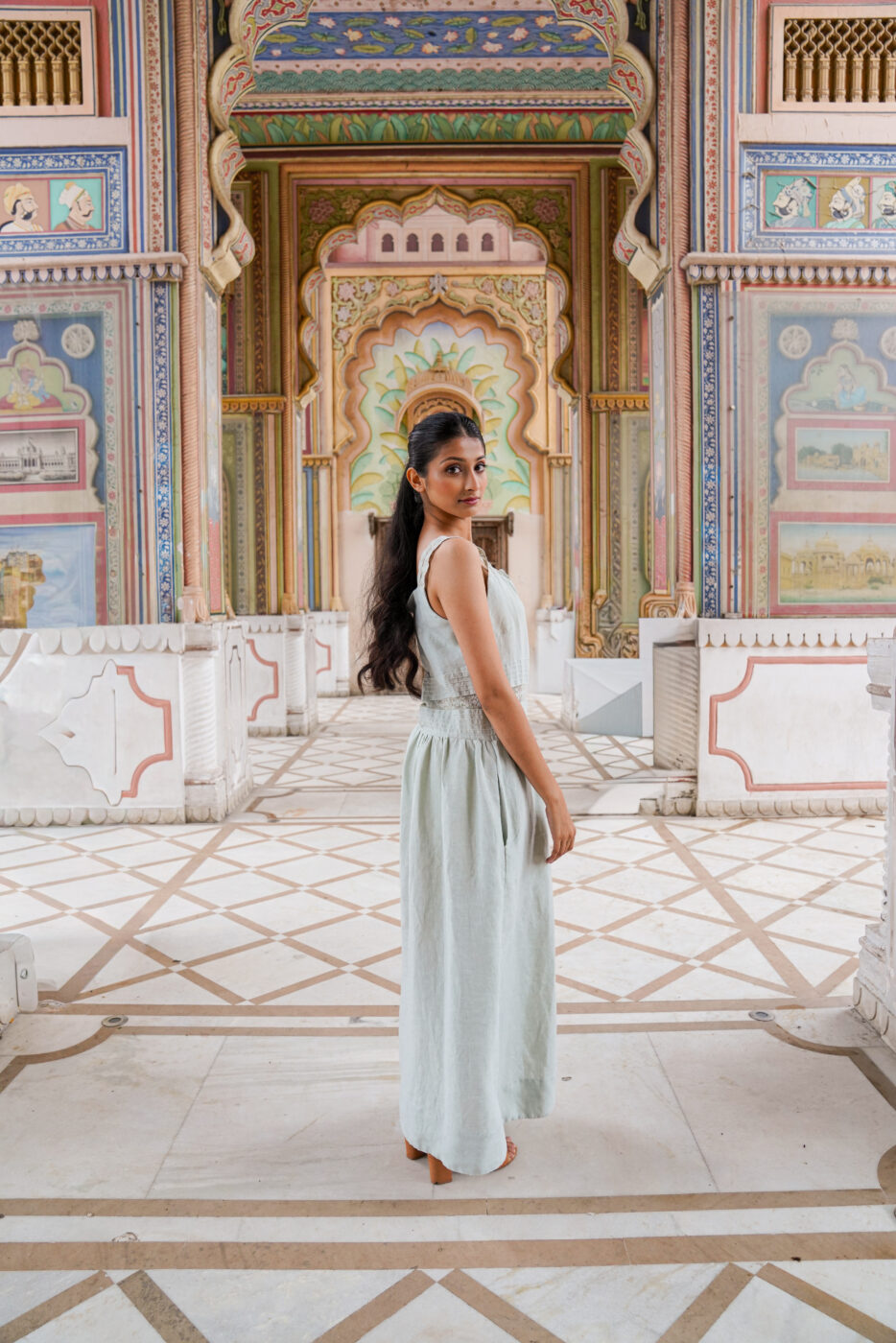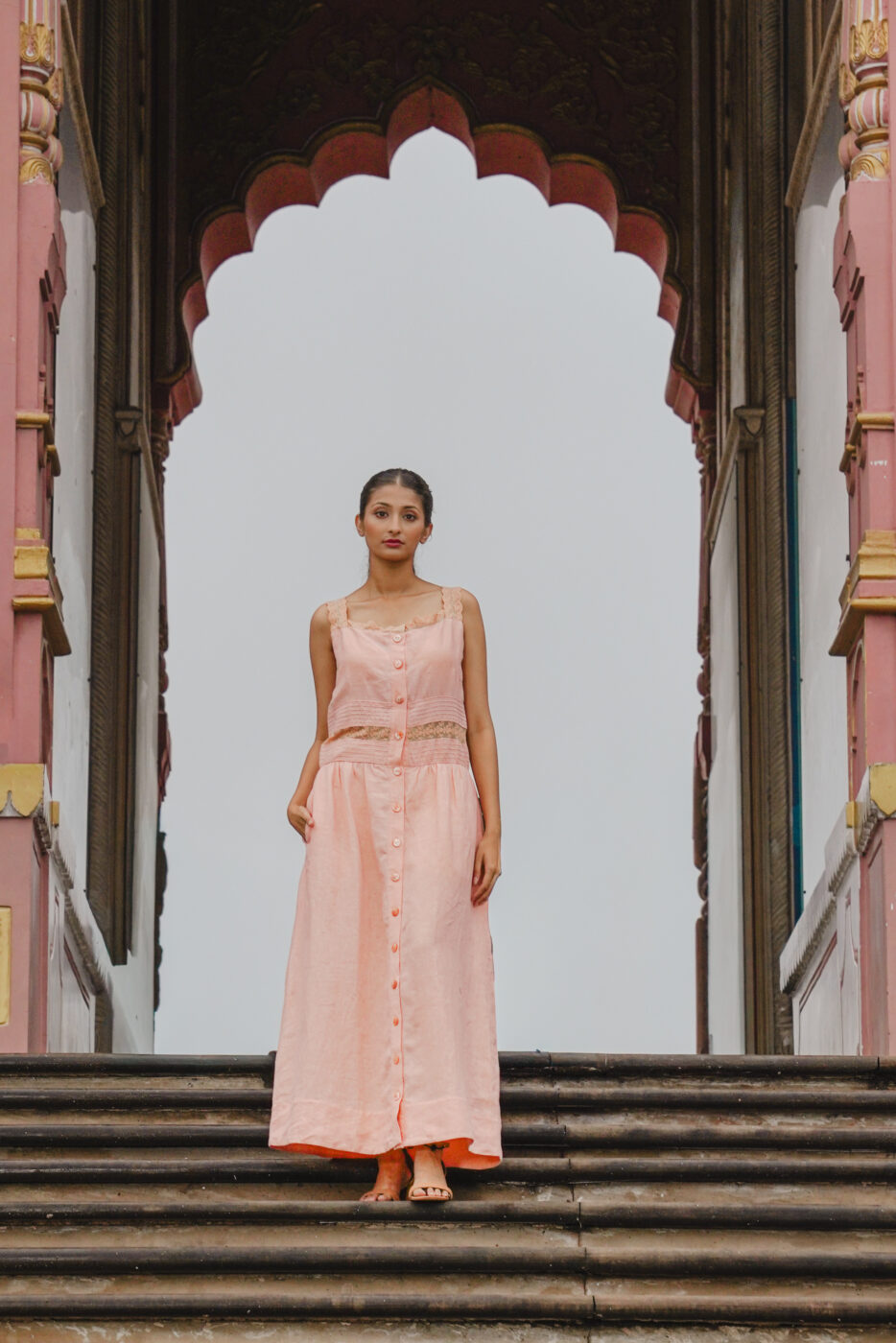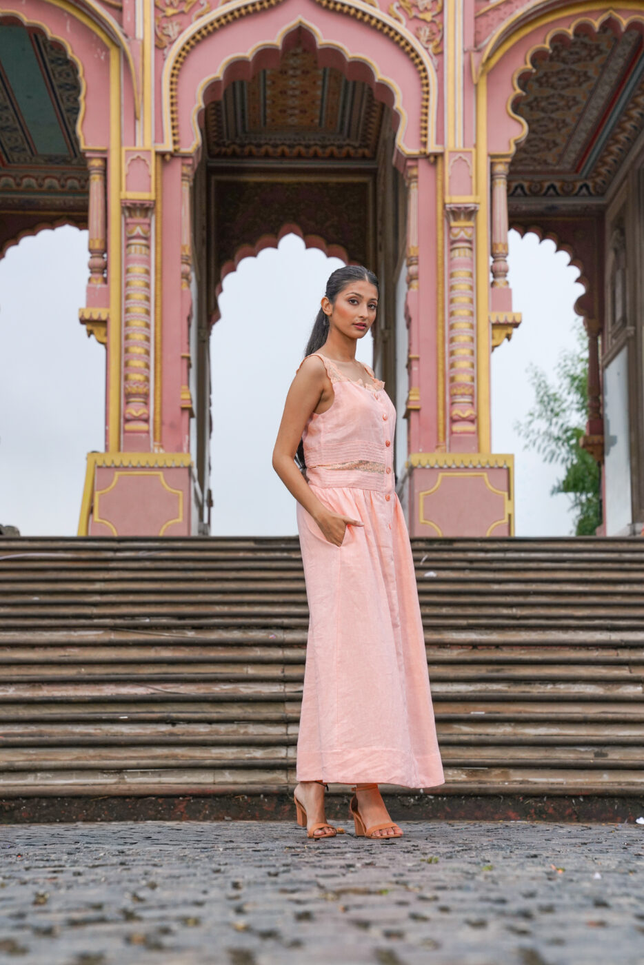 O Vestido Maharani nasce da mesma base delicada e sofisticada da Blusa Rani, agora transformada em uma peça única, fluida e surpreendentemente feminina. Confeccionado em linho puro, ele traz a textura natural, o frescor e o caimento absoluto que são assinatura da SAT.