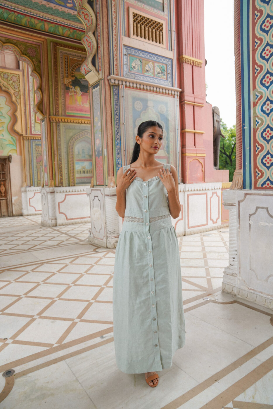O vestido conta ainda com bolsos embutidos nas laterais, discretos e funcionais, e fechamento frontal completo em botões de madrepérola, tingidos na mesma cor do linho para manter a harmonia visual.